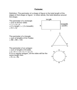 Perimeter and Area are presented by Math Goodies. Learn perimeter and area of polygons at your own pace.,A PowerPoint presentation of Perimeter & Area for 4th and 5th grade.,Formula for area and perimeter of a trapezoid Math - How to Find the Surface Area and Perimeter of a Trapezoid Video; Perimeter Area and Volume of Common Shapes ,prism: 2B + Ph, where B is the area of a base, P is the perimeter of a base, and h is the height of the prism. pyramid: , where B is the area of the base, ,The real area is 10,000 2 times the area of the shape on the map. Nevertheless there is no relation between the area and the perimeter of an ordinary shape.,Trapezoid Perimeter = area + b1 + b2 + c P = a + b1 + b2 + c: Circle Try the Online tool. The distance around the circle is a circumference. The distance across the ,Area and Perimeter of Rectangle . Math Manipulatives : Logic and Thinking Games That Will Give Your Brain a Workout,Click on a shape to find out how to calculate the perimeter, then have a go yourself.,18147062 all about area perimeter 2. Recommend: Tweet. Featured link: Download direct link: Area and Perimeter. Download. Download Now from scribd:,All About Area & Perimeter 2 - Free download or readfalse online for free.